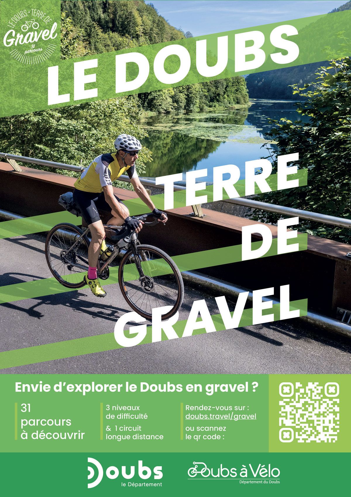 Mission d’accompagnement global du Département du Doubs dans la création et le déploiement de 31 circuits gravel, répartis selon trois niveaux de difficulté :
