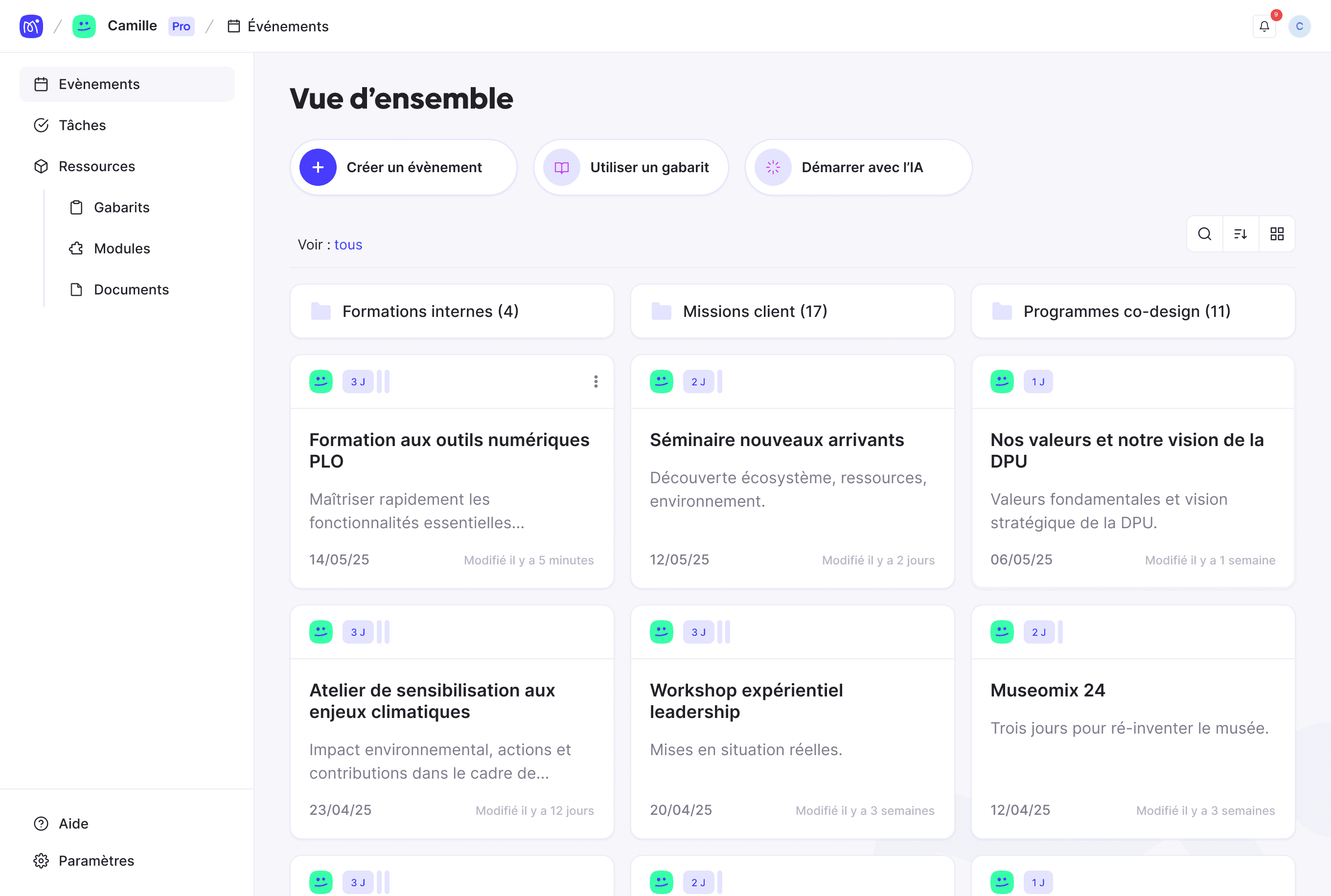 Créer un outil simple, modulaire et collaboratif pour aider les professionnels de l’animation (facilitateurs, formateurs, consultants, collectivités…) à construire et partager facilement leurs déroulés d’ateliers, de séminaires ou de formations.
