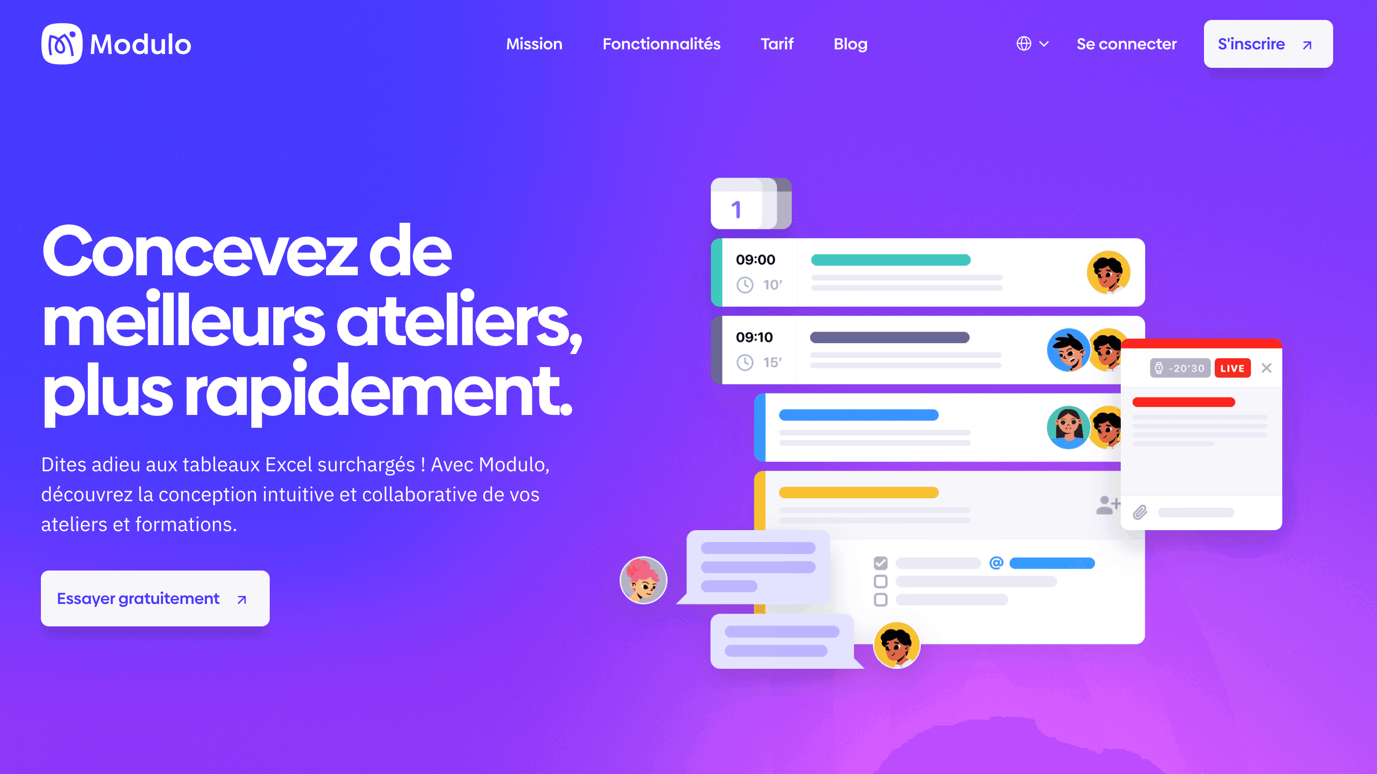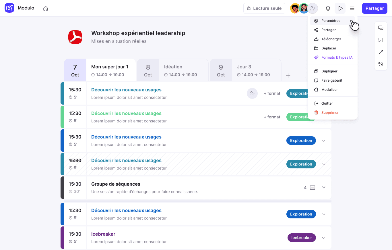 Modulo.io permet de structurer un événement à partir de séquences, pensées comme des briques simples et indépendantes. Chaque séquence peut être annotée avec un format (plénière, binôme…) et un type (brainstorm, icebreaker…), et enrichie avec des durées, des liens, des fichiers ou des commentaires.